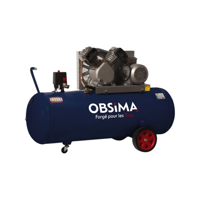 Groupe fonte bicylindre en V, monoétagé. Composants longue durée (clapets haut rendement, triple segmentation, cylindre en fonte, culasse en aluminium, 2 filtres à air). Détendeur avec sortie raccord rapide, manomètre 16 bar, contacteur manométrique, clapet anti-retour, soupape de sécurité CE. Robinet de purge. Grosses roues avec roue directrice avant. Alimentation : 400 V Triphasée Puissance : 3 cv Réservoir : 150 l Pression maxi. : 10 bar Poids : 79 kg Dimensions : 128 x 49 x 83 cm
