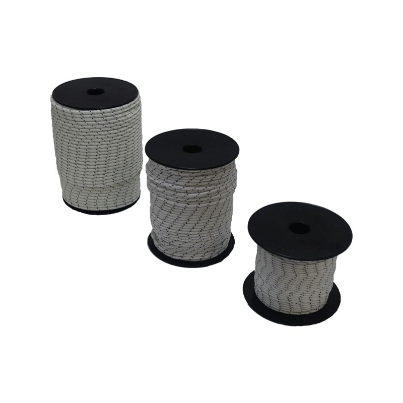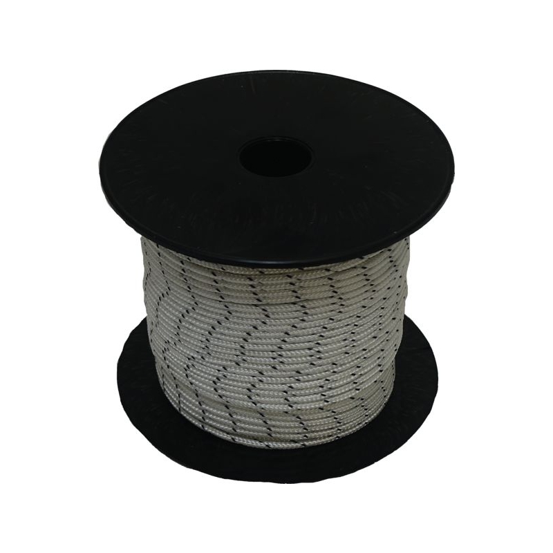 Tresse en polyamide spécialement fabriquée pour les lanceurs de moteur thermique. Haute résistance à la rupture et absorption des chocs au lancement du moteur. Carotte de 5 m ou bobine de 100 m.