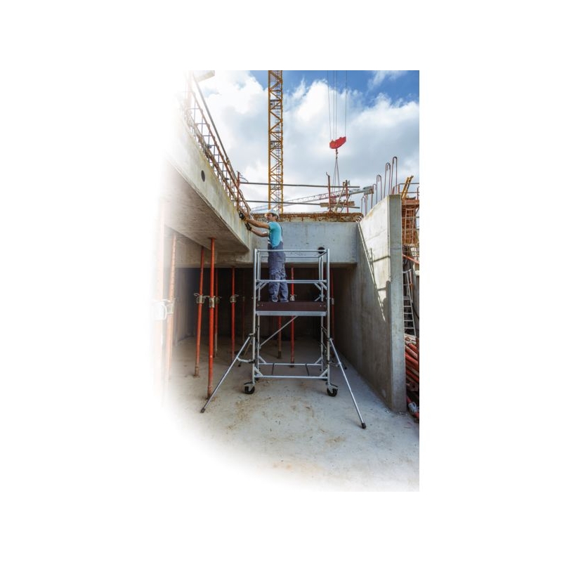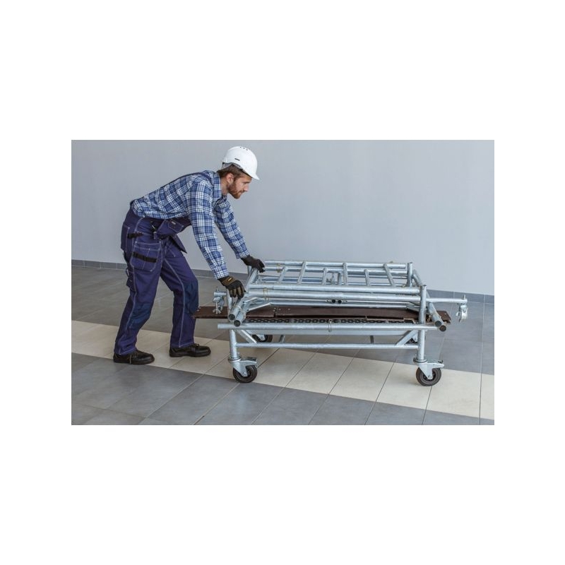 Utilisation sur sol plat, usage ultra intensif. En acier soudé galvanisé. Montants de 45 mm. Base monobloc roulante pouvant servir de chariot de transport. Plancher acier. Garde-corps monobloc. Montage et démontage sans vis ni outils, en sécurité. Roues directionnelles et autobloquantes Ø 160 mm. 4 stabilisateurs pivotants. Passage des portes de 73 cm. Grutable. Dimensions du plancher : 1,10 x 0,60 m Charge maxi. : 200 kg/m² Norme : décret 2004-924