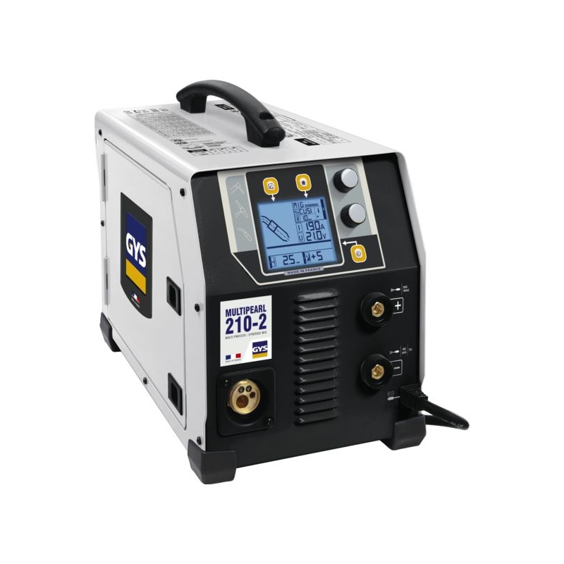 Réuni dans un seul produit les procédés MIG/MAG, TIG et MMA. Fonction MIG/MAG, réglable en manuel ou en synergique. Fonctions SPOT et DELAY disponibles. Soudage TIG Lift courant DC. Le Post Gas et le Downslope sont réglables via le poste grâce à sa torche TIG à connecteur EURO MMA. Soudage de tout type d’électrodes enrobées sauf les aluminium et cellulosiques jusqu’au Ø 5 mm. Le Hot Start et l’Arc Force sont réglables de 0 à 100%. Alimentation : 230 V monophasée Consommation effective : 16 A Courant de soudage TIG : 20 à 200 A Courant de soudage MIG/MAG : 20 à 200 A Facteur de marche à 40°C : 130 A à 60% Livré avec une torche de 3 m équipée pour l’acier, un câble de masse de 2,50 m, un porte-électrode de 2 m.